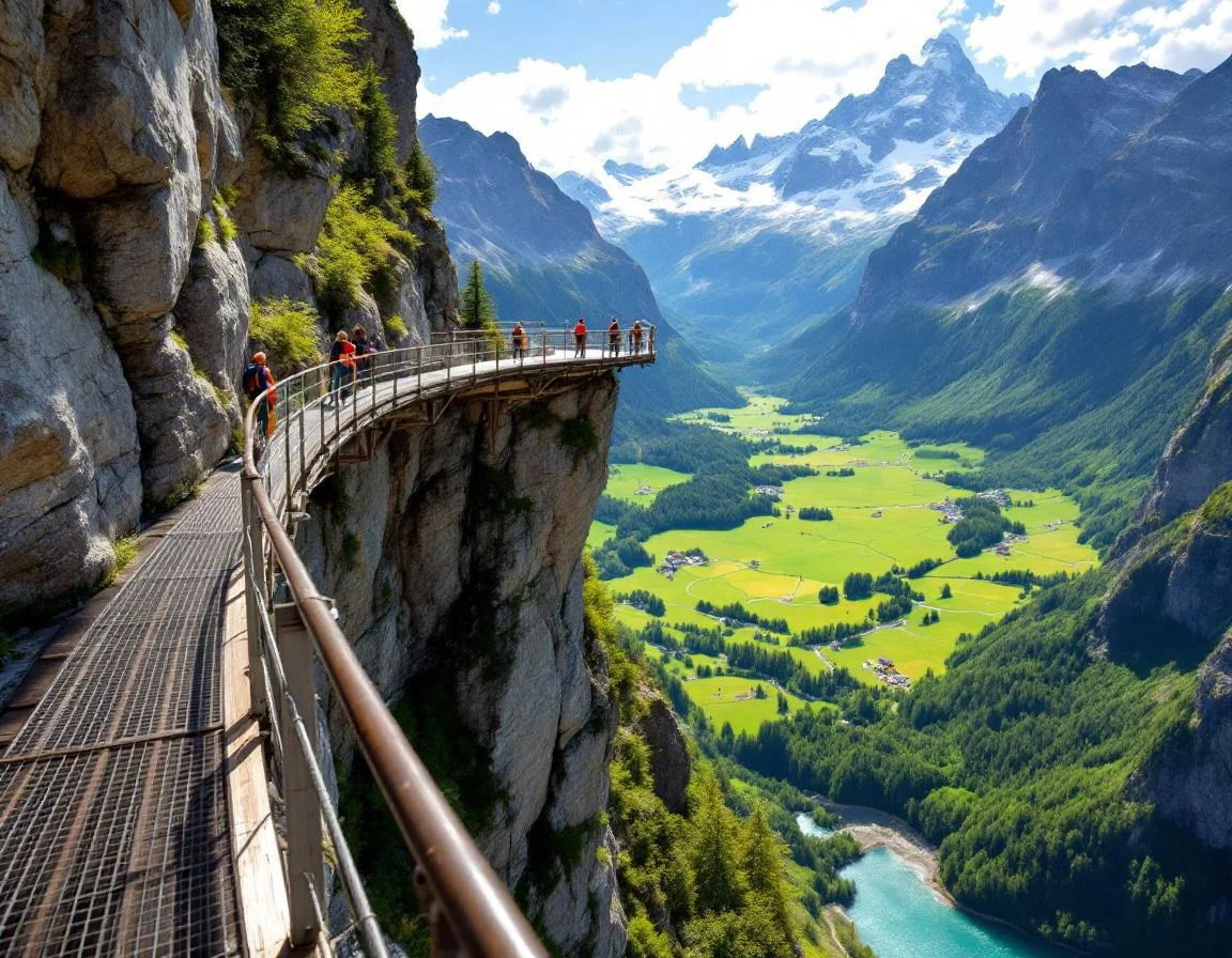 The First Cliff Walk is the highlight for many visitors. This metal walkway, anchored into the cliff face and suspended above the void, leads to a panoramic viewing platform shaped like an arm reaching out towards the peaks. The sensation of walking literally through the sky, with the abyss below your feet and the Alpine giants within arm's reach, is both vertiginous and exhilarating.